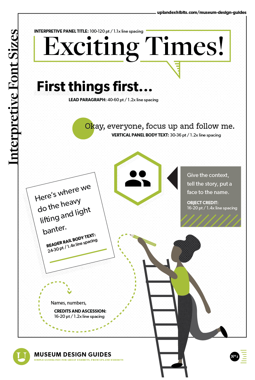 Use this fun poster as your starting point for interpretive font sizes when setting up new projects. From headlines to object basics, interpretive font sizes are outlined for the main interpretive levels you might encounter in an exhibit.