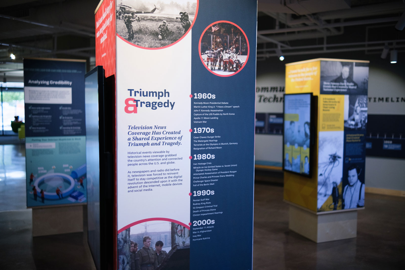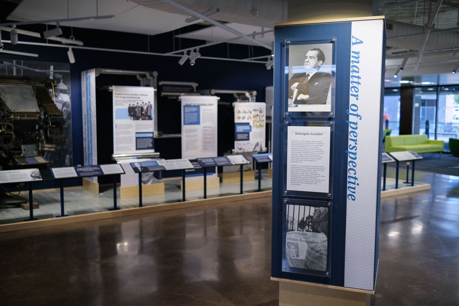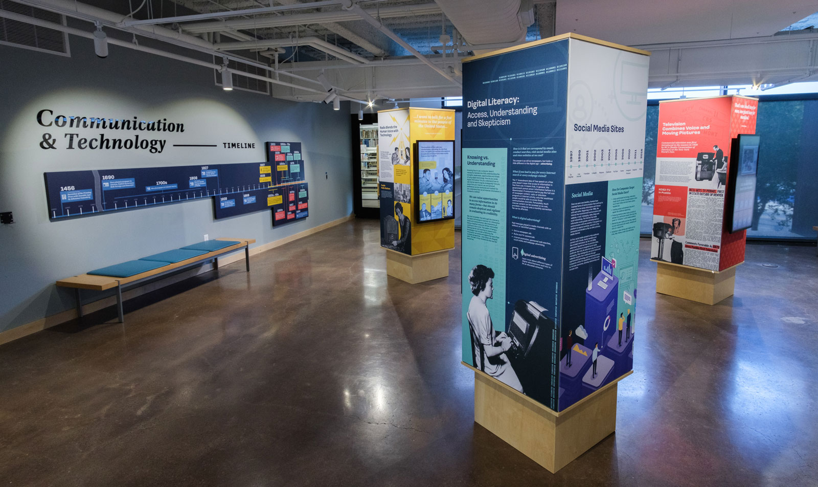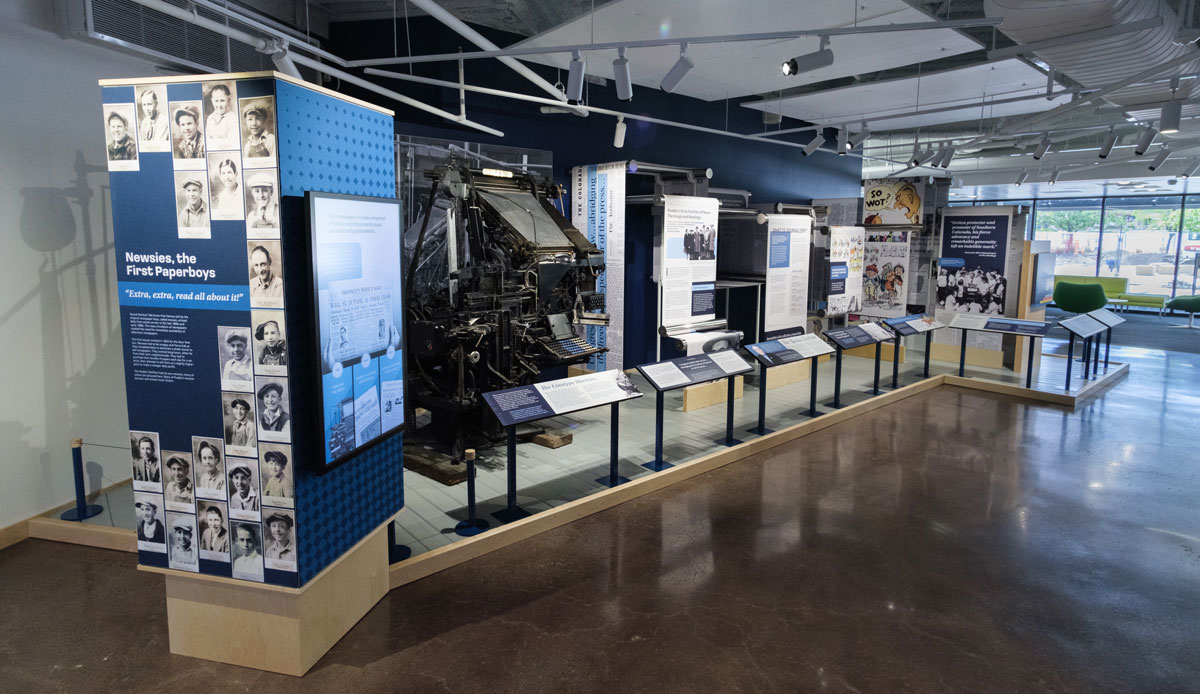 The new exhibit would hold a prominent location on the main level next to an integrated coffee shop, but in a thoroughfare to a meeting room, maker space, and computer lab. With several large banks of windows in close proximity, they wanted a visually pleasing set of exhibits that would increase patrons' media literacy, educate about the first amendment, and share a history of news (communication of information) both on a global scale as well as local.