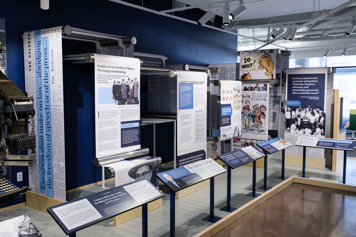 The main feature of the exhibit is the large sculpture featuring long runs of "newsprint" weaving in and around a series of rollers intended to simulate a modern newspaper printing press. The display gives a sense of movement to the space, even though it's stationary. Robert Hoag Rawlings—the namesake of the library building—was a newspaper man, so anchoring the exhibit with this display creates a strong connection between the exhibit and the history of Pueblo.